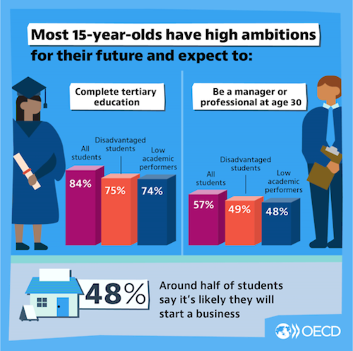 Most 15 years olds have high ambitions for their future and expect to complete tertiary education or be a manager or professional by the age of 30.