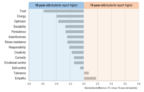 Where the OECD did a longitudinal comparison, the decline in social-emotional skills is getting worse when comparing data from the 2019 survey with the 2023 survey. This is especially true for 15 year-olds, who spent some of their most formative years when they were 12-14 dealing with COVID and repeated lockdowns. Curiosity, creativity and tolerance were highlighted as three skills where average scores have dropped the most over time.